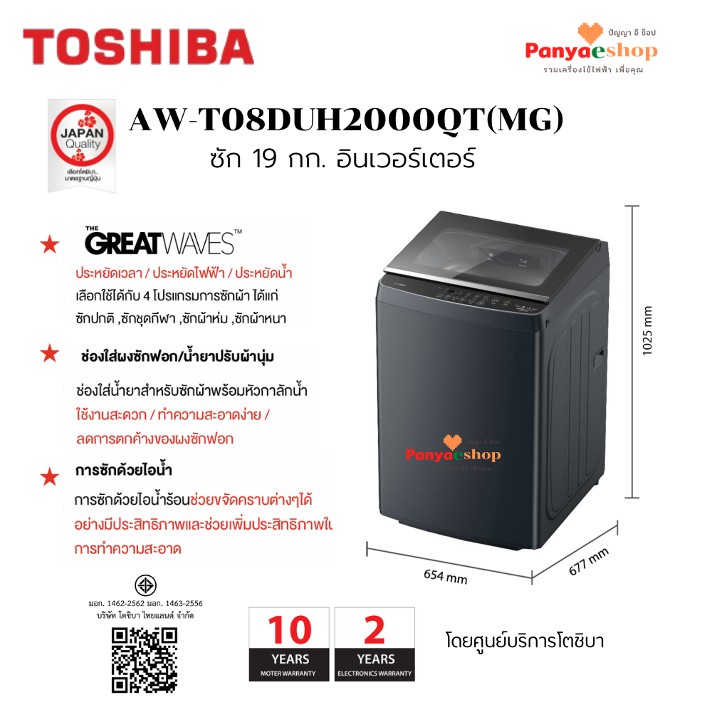 TOSHIBA เครื่องซักผ้าฝาบน รุ่น AW-T08DUH2000QT(MG) จุ 19 กก, ไอน้ำร้อนช่วยขจัดคราบ อินเวอร์เตอร์