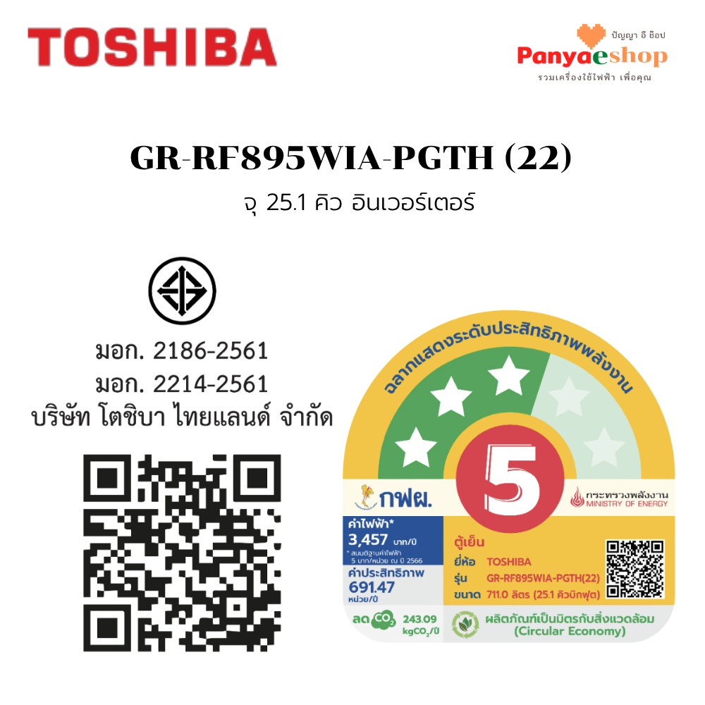 TOSHIBA ตู้เย็น 4 ประตู รุ่น GR-RF895WIA-PGTH(22) ความจุ 25.1 คิว มีระบบทำน้ำแข็งอัตโนมัติ