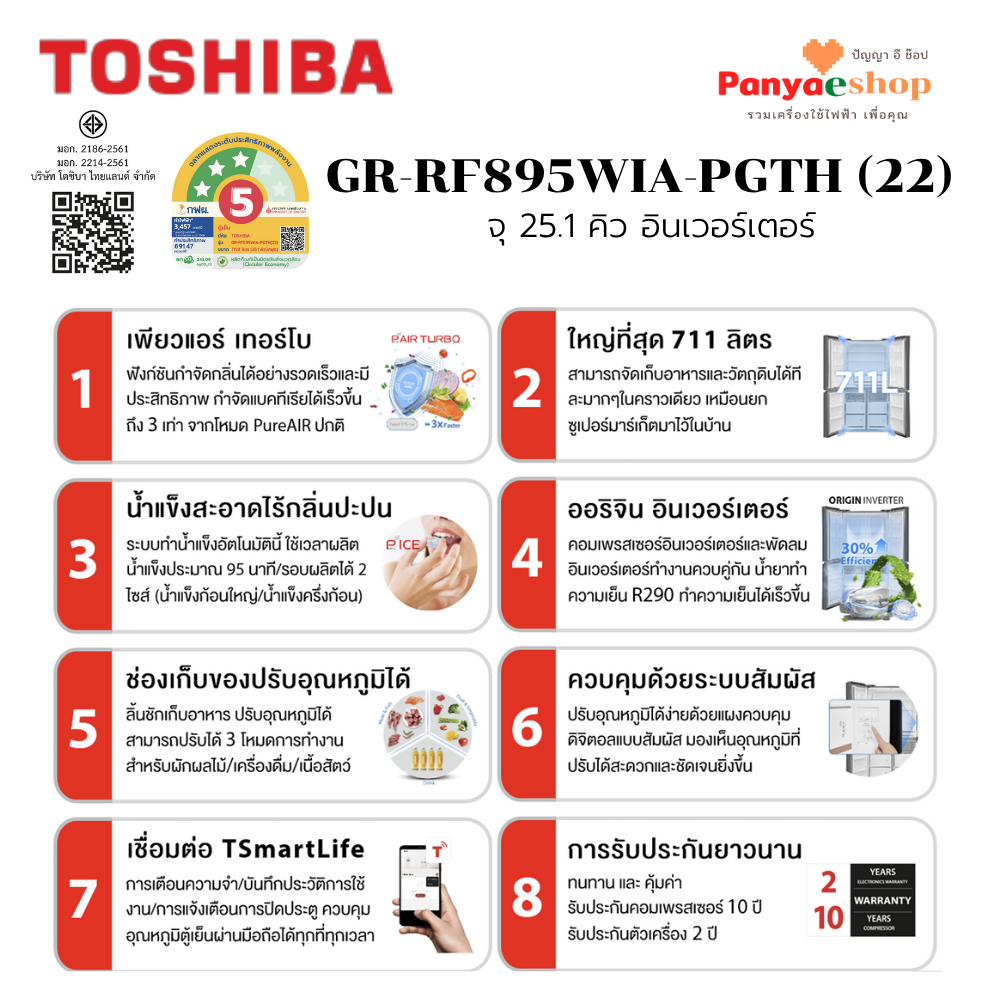 รับประกันสินค้า 2 ปี รับประกันคอมเพรสเซอร์ 10 ปี